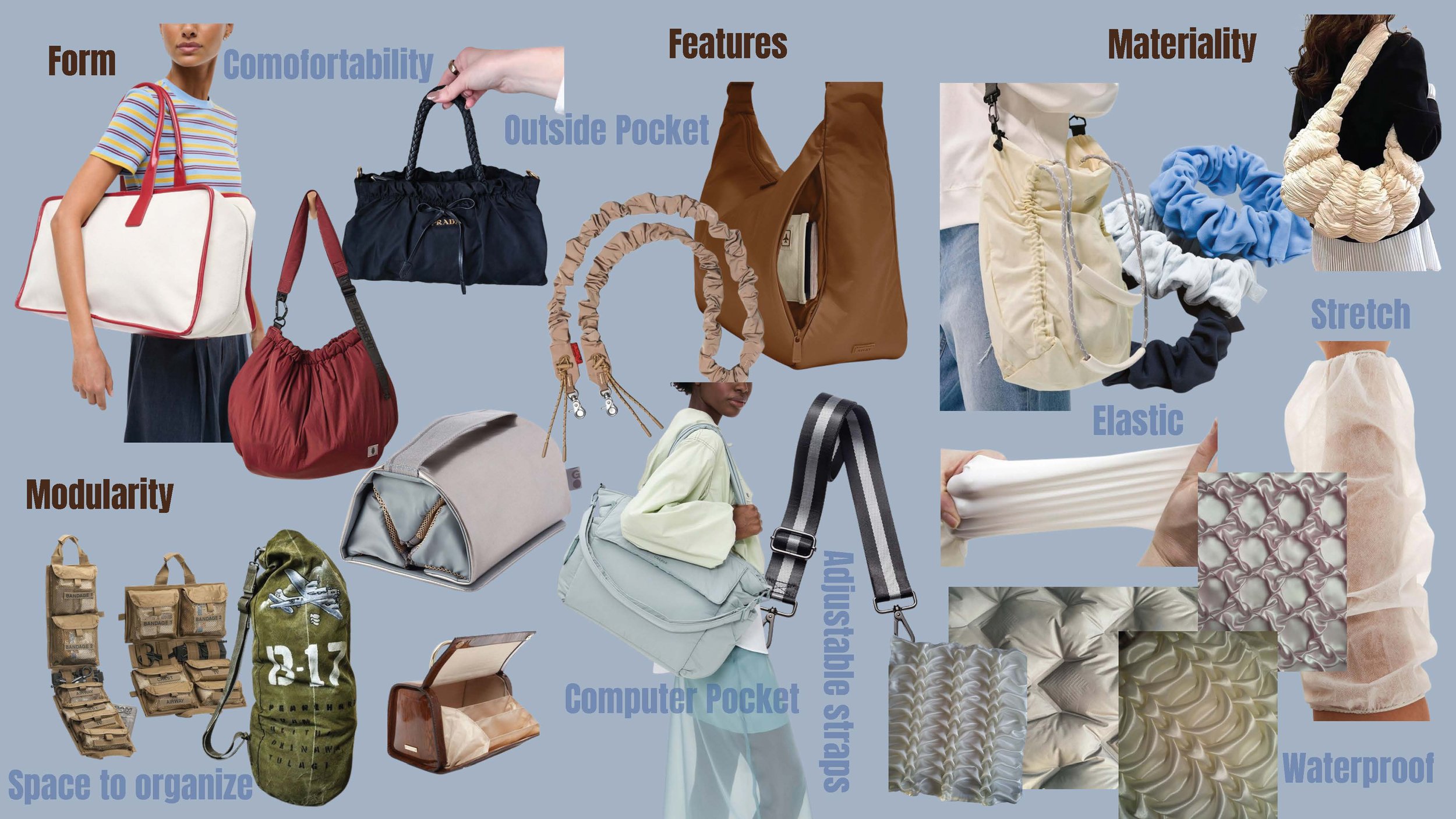 With this bag design I focused on a wide strap with an organic shape and elastic material that would allow for more room and user personalization