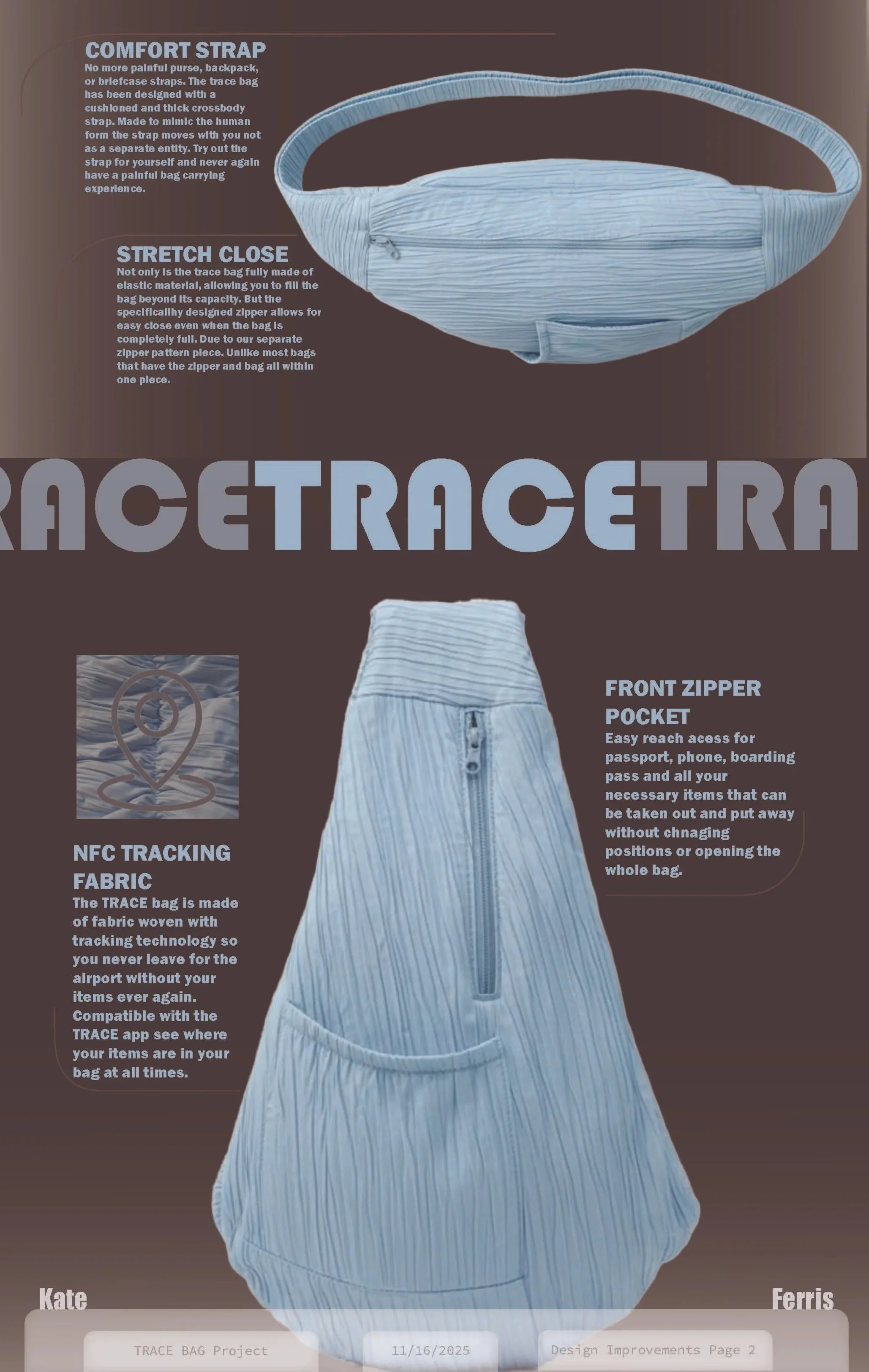 I wanted to continue to add comfort and accessibility to travel and its needs. I started to imagine what could be possible with NFC-tracking fabric. Imagine it could recognize every item inside your bag, like an airtag. Inspired by Apple’s location tracking and Find My, I developed an app that could reflect this futuristic technology. Paired with the carry on bag- travel could be comfortable and reasurring.