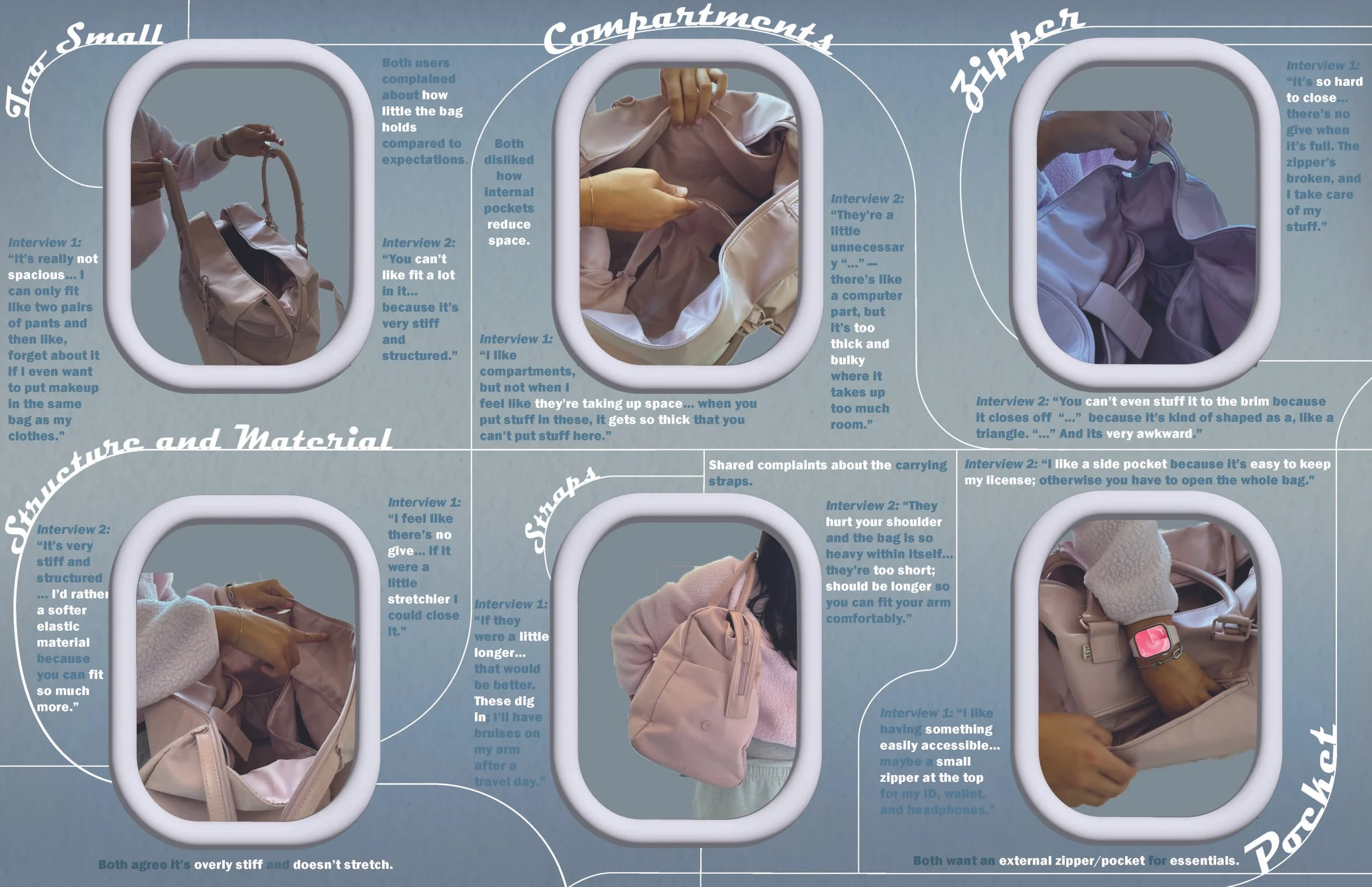 The users identified problems with the strap as well as the rigidy of the bag as main pain points