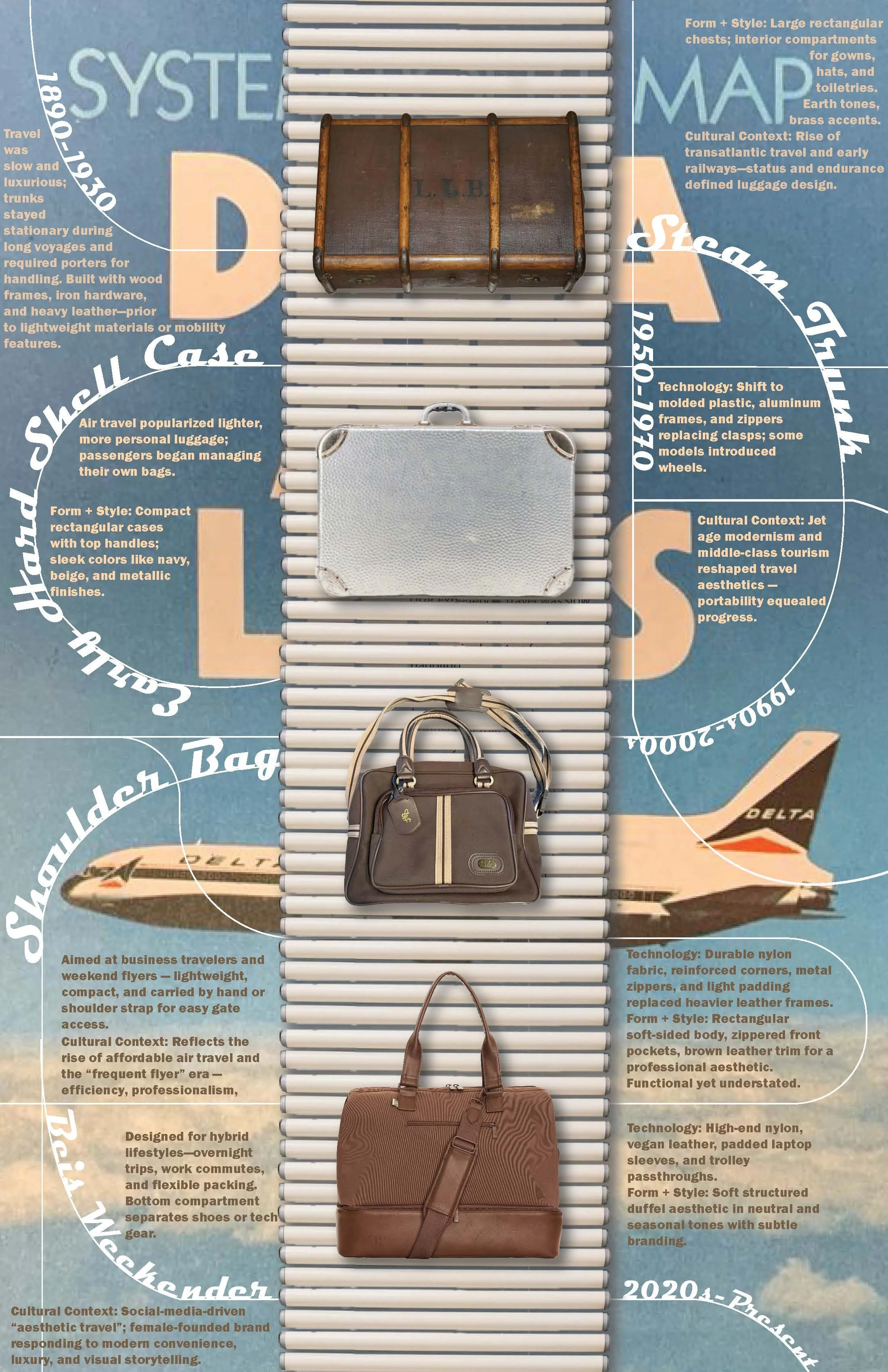 Investigated the evolution of carry-on travel from structured steam trunks to hard-shell rolling cases to soft shoulder bags